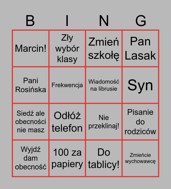 This bingo card has 16 words: 100 za papiery, Pisanie do rodziców, Zmień szkołę, Marcin!, Siedź ale obecności nie masz, Zły wybór klasy, Nie przeklinaj!, Do tablicy!, Pani Rosińska, Frekwencja, Wyjdź dam obecność, Pan Lasak, Odłóż telefon, Syn, Wiadomość na librusie and Zmieńcie wychowawcę.