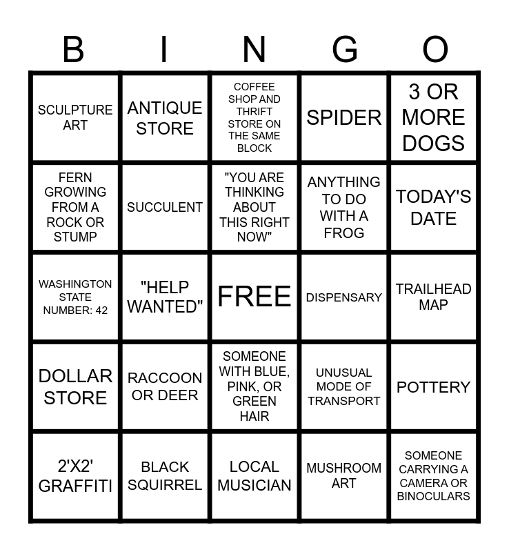 This bingo card has a free space and 24 words: RACCOON OR DEER, BLACK SQUIRREL, "YOU ARE THINKING ABOUT THIS RIGHT NOW", 2'X2' GRAFFITI, 3 OR MORE DOGS, SCULPTURE ART, FERN GROWING FROM A ROCK OR STUMP, ANTIQUE STORE, DISPENSARY, SOMEONE WITH BLUE, PINK, OR GREEN HAIR, ANYTHING TO DO WITH A FROG, WASHINGTON STATE NUMBER: 42, UNUSUAL MODE OF TRANSPORT, POTTERY, SUCCULENT, MUSHROOM ART, TRAILHEAD MAP, COFFEE SHOP AND THRIFT STORE ON THE SAME BLOCK, TODAY'S DATE, "HELP WANTED", SOMEONE CARRYING A CAMERA OR BINOCULARS, DOLLAR STORE, SPIDER and LOCAL MUSICIAN.