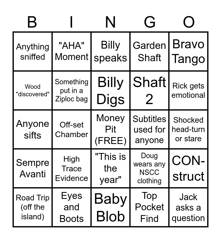 This bingo card has a free space and 24 words: High Trace Evidence, Eyes and Boots, Billy Digs, Road Trip (off the island), Bravo Tango, Anything sniffed, Wood "discovered", "AHA" Moment, Subtitles used for anyone, "This is the year", Shaft 2, Anyone sifts, Doug wears any NSCC clothing, CON-struct, Something put in a Ziploc bag, Top Pocket Find, Shocked head-turn or stare, Billy speaks, Rick gets emotional, Off-set Chamber, Jack asks a question, Sempre Avanti, Garden Shaft and Baby Blob.