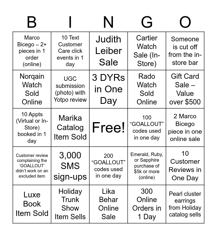 This bingo card has a free space and 44 words: Signature Collection piece over $5k, Pearl cluster earrings from Holiday catalog sells, Harwell Godfrey Bee sells, Luxe Book Item Sold, DYR Purchase, 300 Online Orders in 1 Day, Judith Leiber Sale, Awkward / Fun Enclosure Card, Someone is cut off from the in-store bar, Holiday Trunk Show Item Sells, Cartier Watch Sale (In-Store), 100 “GOALLOUT” codes used in one day, 200 “GOALLOUT” codes used in one day, 3,000 SMS sign-ups, Roberto Coin catalog bypass Ring Sale, Lika Behar Online Sale, Men’s Lagos sale (In-store), 10 Appts (Virtual or In-Store) booked in 1 day, Diamond Studs sale over 2.00 cttw, Gift Card Sale – Value over $500, 10 Text Customer Care click events in 1 day, Rahaminov online order, 3 watch purchases in 1 day (online), Marco Bicego – 2+ pieces in 1 order (online), Roberto Coin Baby Cross Necklace Sold (online), 2 Marco Bicego piece in one online sale, 10 Roberto Coin pieces in one day (online), Click-n-buy directly from Instagram or Facebook, Emerald, Ruby, or Sapphire purchase of $5k or more (online), Customer review complaining the ‘GOALLOUT’ didn’t work on an excluded item, 3 Signature pieces in one day, 10 Customer Reviews in One Day, Swarovski birds from luxe book sells, S.T. Dupont Lighter Sold Online, Marika Catalog Item Sold, 100 units sold for Radko flash sale, One of the Precision Set pave rings from the Catalog Sold, 20 Jellycats in 1 day, 3 DYRs in One Day, Norqain Watch Sold Online, Rado Watch Sold Online, Oris Watch Sold Online, UGC submission (photo) with Yotpo review and Men’s OMI ring from Luxe book.
