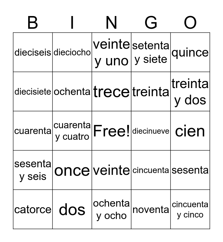 This bingo card has a free space and 24 words: once, dos, trece, catorce, quince, dieciseis, diecisiete, dieciocho, diecinueve, veinte, treinta, cuarenta, cincuenta, sesenta, ochenta, noventa, cien, veinte y uno, treinta y dos, cuarenta y cuatro, cincuenta y cinco, sesenta y seis, setenta y siete and ochenta y ocho.