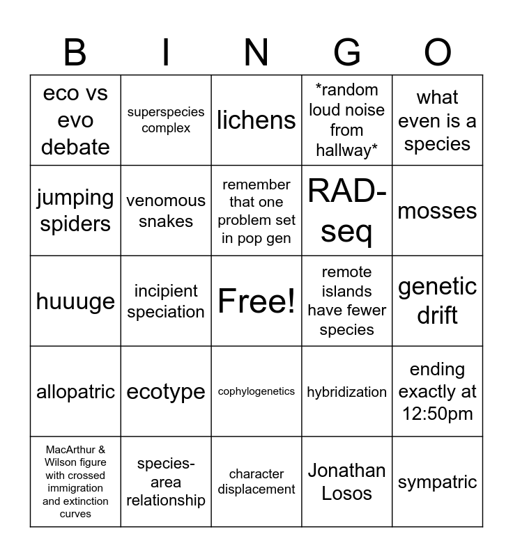 This bingo card has a free space and 35 words: horizontal gene transfer, priority effects, anoles, venomous snakes, cophylogenetics, *random loud noise from hallway*, jumping spiders, Theory of Island Biogeography, remember that one problem set in pop gen, polyploid, huuuge, what even is a species, functional traits, plants vs animals debate, eco vs evo debate, remote islands have fewer species, Jonathan Losos, incipient speciation, allopatric, sympatric, hybridization, MacArthur & Wilson figure with crossed immigration and extinction curves, ending exactly at 12:50pm, species-area relationship, lichens, mosses, supervolcano, mossome, RAD-seq, genetic drift, ecological drift, character displacement, ecotype, superspecies complex and genetic bottleneck.