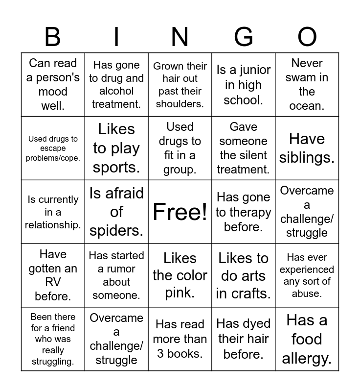 This bingo card has a free space and 24 words: Has started a rumor about someone., Overcame a challenge/ struggle, Used drugs to fit in a group., Been there for a friend who was really struggling., Never swam in the ocean., Can read a person's mood well., Used drugs to escape problems/cope., Has gone to drug and alcohol treatment., Has gone to therapy before., Likes the color pink., Gave someone the silent treatment., Is currently in a relationship., Likes to do arts in crafts., Has ever experienced any sort of abuse., Likes to play sports., Has dyed their hair before., Overcame a challenge/ struggle, Grown their hair out past their shoulders., Have siblings., Is afraid of spiders., Has a food allergy., Have gotten an RV before., Is a junior in high school. and Has read more than 3 books..