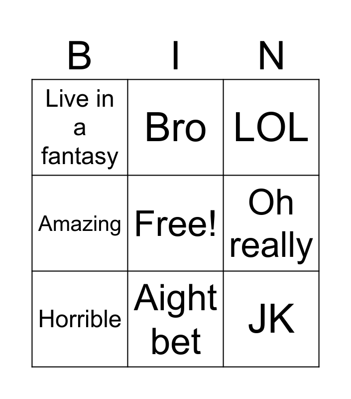 This bingo card has a free space and 21 words: Let's go, Ok, Bro, Yalla party, Cool, Horrible, Live in a fantasy, LOL, For real, Aight bet, For sure, Amazing, Annoyiong, Wasted, Oh really, Come on, What a bummer, Nonesence, JK, Maybe and Low key.