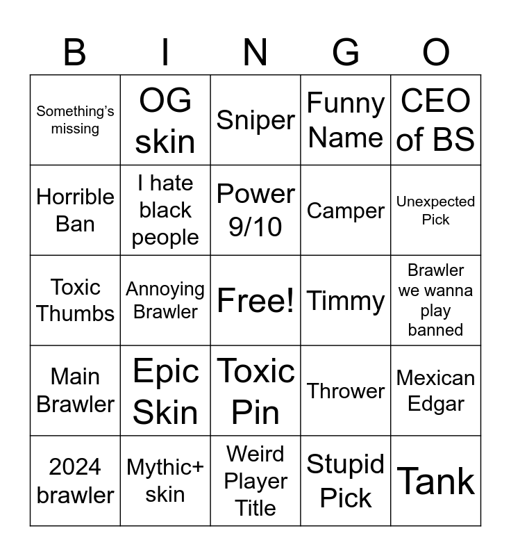 This bingo card has a free space and 24 words: Epic Skin, Mythic+ skin, Power 9/10, 2024 brawler, CEO of BS, Something’s missing, Horrible Ban, OG skin, Timmy, Toxic Pin, Camper, Toxic Thumbs, Thrower, Mexican Edgar, I hate black people, Stupid Pick, Brawler we wanna play banned, Sniper, Unexpected Pick, Annoying Brawler, Tank, Main Brawler, Funny Name and Weird Player Title.