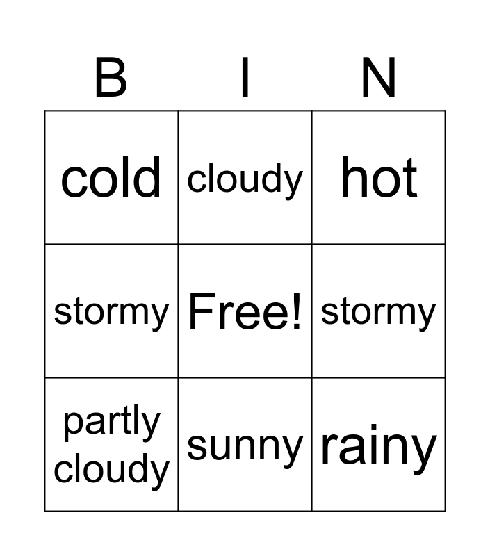 This bingo card has a free space and 10 words: sunny, hot, cold, rainy, stormy, partly cloudy, cloudy, snowy, stormy and rainbow.