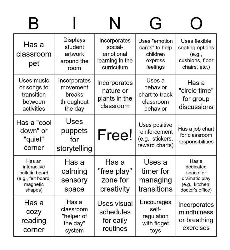 This bingo card has a free space and 25 words: Has a calming sensory space, Uses visual schedules for daily routines, Incorporates nature or plants in the classroom, Has a cozy reading corner, Uses flexible seating options (e.g., cushions, floor chairs, etc.), Has a classroom pet, Uses music or songs to transition between activities, Displays student artwork around the room, Uses positive reinforcement (e.g., stickers, reward charts), Has a "free play" zone for creativity, Uses a behavior chart to track classroom behavior, Has a "cool down" or "quiet" corner, Uses a timer for managing transitions, Has a dedicated space for dramatic play (e.g., kitchen, doctor's office), Incorporates movement breaks throughout the day, Has a space for independent play and exploration, Has a job chart for classroom responsibilities, Incorporates social-emotional learning in the curriculum, Has a "circle time" for group discussions, Uses puppets for storytelling, Incorporates mindfulness or breathing exercises, Has a classroom "helper of the day" system, Has an interactive bulletin board (e.g., felt board, magnetic shapes), Uses "emotion cards" to help children express feelings and Encourages self-regulation with fidget toys.