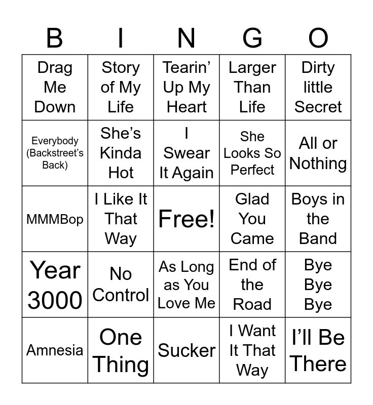 This bingo card has a free space and 28 words: Bye Bye Bye, What Makes You Beautiful, She Looks So Perfect, I Want It That Way, Everybody (Backstreet’s Back), Tearin’ Up My Heart, Story of My Life, Year 3000, Glad You Came, Amnesia, MMMBop, Larger Than Life, One Thing, Sucker, All or Nothing, You Got It (The Right Stuff), No Control, She’s Kinda Hot, I Swear It Again, As Long as You Love Me, Drag Me Down, 18, I’ll Be There, I Like It That Way, Boys in the Band, End of the Road, Dirty little Secret and Hey there Delilah.