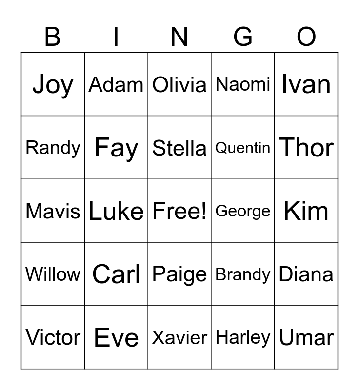 This bingo card has a free space and 24 words: Carl, Eve, Stella, Victor, Ivan, Joy, Randy, Adam, George, Paige, Quentin, Mavis, Brandy, Diana, Fay, Harley, Kim, Olivia, Thor, Luke, Umar, Willow, Naomi and Xavier.