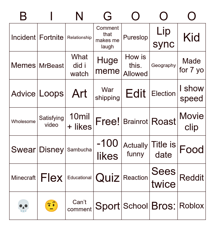 This bingo card has a free space and 48 words: Reaction, Geography, Sport, Satisfying video, Art, Movie clip, Fortnite, 🤨, Lip sync, -100 likes, Kid, Comment that makes me laugh, Election, Edit, Minecraft, Roast, Memes, Made for 7 yo, Sees twice, Pureslop, How is this. Allowed, 10mil + likes, Incident, MrBeast, Reddit, What did i watch, I show speed, 💀, War shipping, Loops, Bros:, Brainrot, Food, Flex, Wholesome, Actually funny, Title is date, Advice, Sambucha, Educational, Swear, Roblox, Relationship, Can’t comment, Huge meme, Quiz, Disney and School.