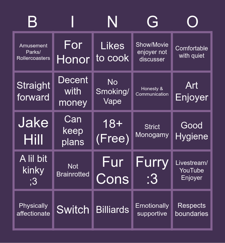 This bingo card has a free space and 24 words: Not Brainrotted, Switch, No Smoking/ Vape, Physically affectionate, Comfortable with quiet, Amusement Parks/ Rollercoasters, Straight forward, For Honor, Strict Monogamy, Fur Cons, Honesty & Communication, Jake Hill, Furry :3, Livestream/ YouTube Enjoyer, Decent with money, Emotionally supportive, Good Hygiene, Likes to cook, Art Enjoyer, Can keep plans, Respects boundaries, A lil bit kinky ;3, Show/Movie enjoyer not discusser and Billiards.