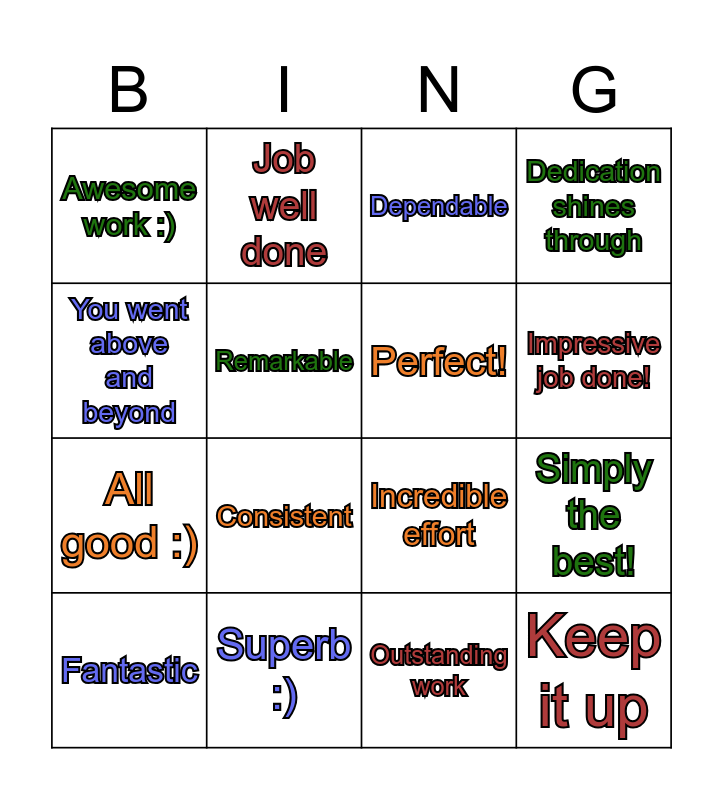 This bingo card has 16 words: Superb :), Simply the best!, Dependable, Awesome work :), All good :), Job well done, Incredible effort, Outstanding work, You went above and beyond, Remarkable, Fantastic, Dedication shines through, Consistent, Impressive job done!, Perfect! and Keep it up.