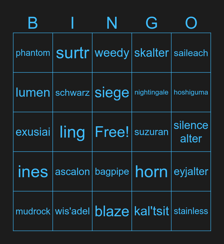 This bingo card has a free space and 40 words: fiammetta, exusiai, typhon, schwarz, wis'adel, bagpipe, siege, vigil, saileach, ines, ling, skalter, stainless, silence alter, suzuran, ascalon, gladiia, phantom, dorothy, weedy, eyjalter, kal'tsit, nightingale, lumen, reed alter, goldenglow, ceobe, ebenholz, lin, ifrit, saria, mudrock, jessica alter, horn, hoshiguma, blaze, irene, thorns, surtr and mountain.