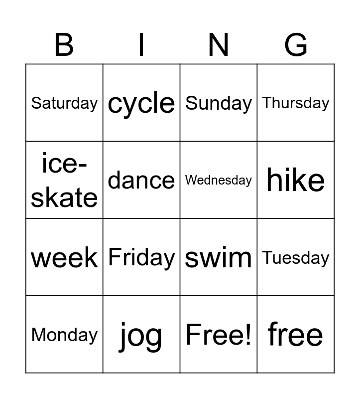 This bingo card has 17 words: Free!, Monday, Sunday, Saturday, Friday, Thursday, Tuesday, Wednesday, hike, dance, jog, swim, ice-skate, cycle, week, weekend and free.