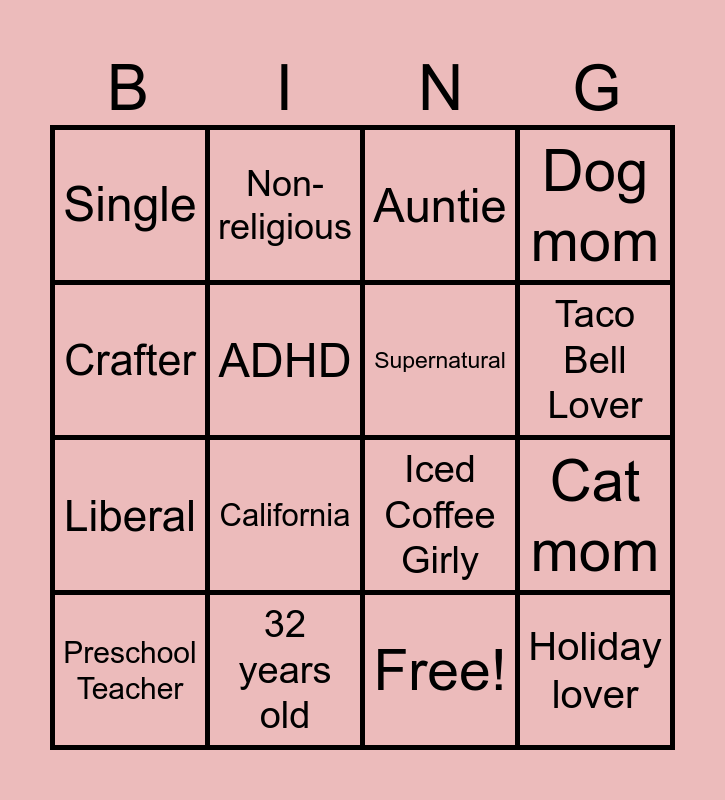 This bingo card has 17 words: Free!, Preschool Teacher, Auntie, Single, California, Dog mom, Cat mom, Supernatural, Taco Bell Lover, ADHD, 32 years old, Iced Coffee Girly, Crafter, Non-religious, Liberal, Too many hobbies and Holiday lover.