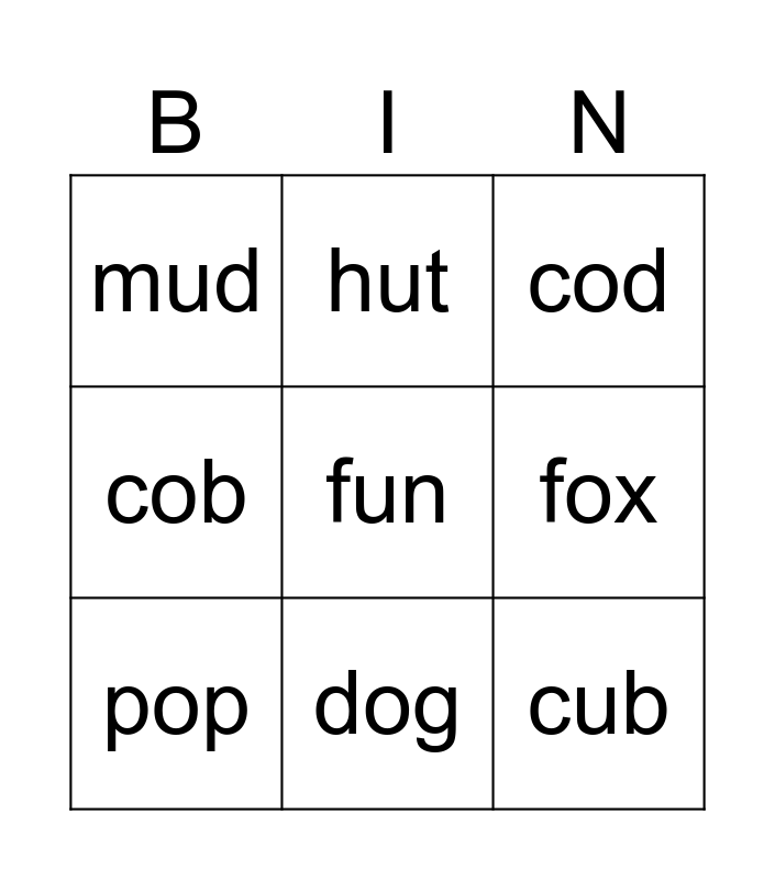This bingo card has 9 words: pop, cod, hut, cob, mud, fox, fun, cub and dog.