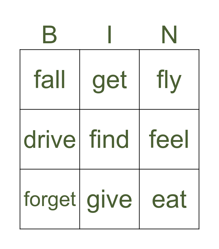 This bingo card has a free space and 8 words: drive, get, feel, forget, fly, fall, give and eat.