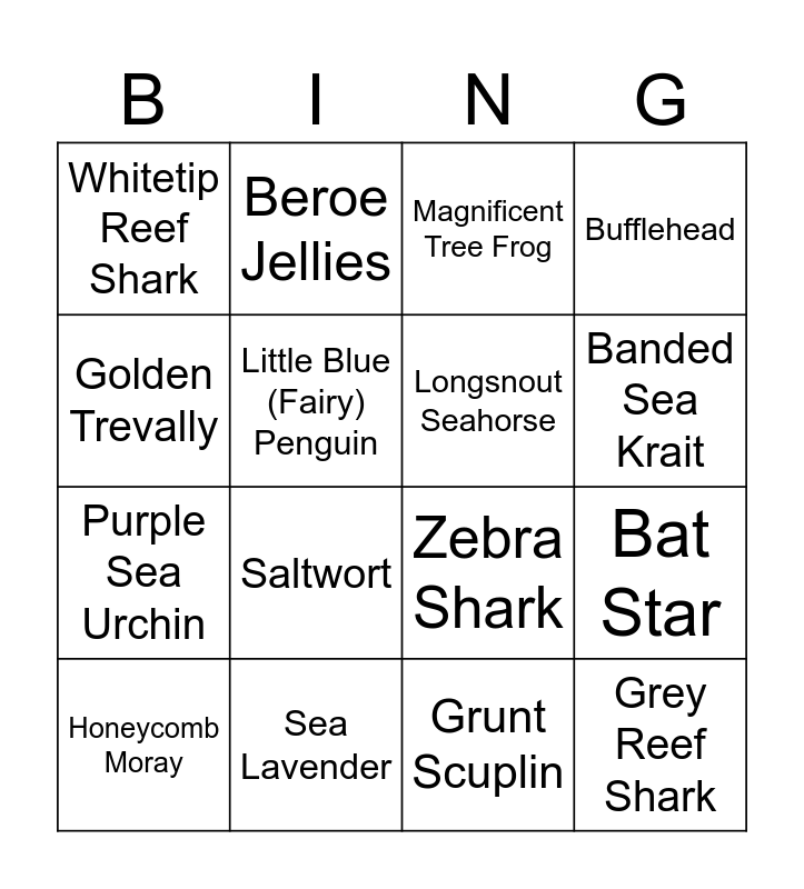 This bingo card has 143 words: Crested Auklet, Horned Puffin, Pigeon Guillemot, Tufted Puffin, Ballonfish, Bluespotted Jawfish, Convict Surgeonfish, King Angelfish, Free!, Panamic Soldierfish, Spotfin Porcupinefish, Atlantic Mudskipper, Dwarf Indian Mudskipper, Moon Jelly, Bat Ray, California Barracuda, California Sheephead, Giant Sea Bass, Leopard Shark, White Sea Bass, Emperor Penguin, Magellanic Penguin, Lorikeet, Aggregating Anemone, Atlantic Sea Nettle, Bat Star, Beroe Jellies, Comb Jelly, Fish Eating Anemone, Frog Fish, Giant Pacific Octopus, Giant Spider Crab, Green Sea Anemone, Grunt Scuplin, Japanese Sea Nettle, Lion's Mane Jelly, Pacific Sea Nettle, Pacific Spiny Lumpsucker, Purple Sea Urchin, Red Abalone, Red Sea Urchin, Shiner Surfperch, Silver Surfperch, Southern Sea Otter, Sunflower Sea Star, Threespine Stickleback, Blue-Tongued Skink, Pacific Cleaner Shrimp, Prehensile-Tailed Skink, Black Longspine Urchin, Delta Smelt, Tidepool Sculpin, Yellowtail, Shovelnose Guitarfish, Bumpy Jelly, Flower Hat Jelly, Purple Striped Jelly, Red - Eyed Medusa, Spotted Lagoon Jelly, Upside Down Sea Jelly, California Sea Lion, Harbor Seal, Yellow Crowned Night Heron, Blacktip Reef Shark, Epaulette Shark, Grey Reef Shark, Guam Kingfisher, Mangrove Ray, Pacific Cownose Ray, Reticulate Whipray, Sandbar Shark, Whitetip Reef Shark, Zebra Shark, Alkali Heath, American Avocet, Black Perch, Black-bellied Plover, Black-necked Stilt, Bufflehead, California Cordgrass, Eelgrass, Pickleweed, Ruddy Deck, Saltgrass, Saltwort, Salty Susan, Sea Lavender, Snowy Egret, Spiny Rush, Western Snowy Plover, Southern California Coastal Steelhead, Black-crowned Night Heron, California Brown Sea Hare, California Halibut, California Moray, California Two-spot Octopus, Egg-Yolk Jelly, Garibaldi, Giant Sea Bass, Halfmoon, Little Blue (Fairy) Penguin, Sarcastic Fringehead, Swell Shark, Banded Archerfish, Banded Sea Krait, Bluefin Trevally, Bonnethead Shark, Clownfish, Coral Crab, Day Octopus, Flamboyant Cuttlefish, Golden Poison Dart Frog, Golden Trevally, Honeycomb Moray, Leafy Seadragon, Longsnout Seahorse, Mandarin Goby, Olive Ridley Sea Turtle, Powder Blue Tang, Reef Stonefish, Rockmover Wrasse, Spotted Lagoon Jelly, Staghorn Coral, Stinging Eel Catfish, Sun Coral, Watchman Goby, Wedge-tail Triggerfish, Weedy Scorpionfish, Weedy Seadragon, Yellow Tang, Green Sea Turtle, Palette Surgeonfish, Queensland Grouper, Whitespotted Eagleray, Blue Poison Dart Frog, Golden Manetella Frog, Green and Black Poison Dart Frog, Kaiser Mountain Newt, Magnificent Tree Frog, Mossy Frog, Red-backed Poison Dart Frog, Solomon Island Leaf Frog and Northern Pacific Tree Frog.