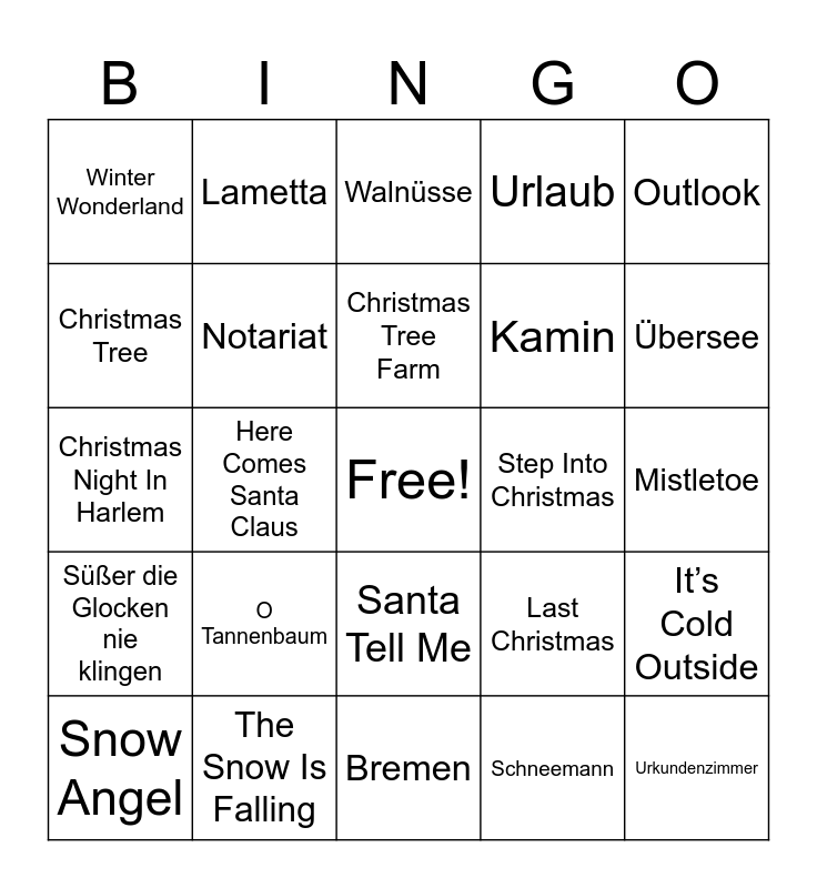 This bingo card has a free space and 157 words: A Holly Jolly Christmas, A Winter's Tale, Advent, Advent, ein Lichtlein brennt, All I Want for Christmas Is You, Alle Jahre wieder, Baby's first Christmas, Brief an den Weihnachtsmann, Christmas Eve, Christmas for Cowboys, Christmas In My Heart, Christmas Is My Time of Year, Christmas Lights, Christmas Night In Harlem, Christmas Time, Christmas Tree, Christmas Tree Farm, Christmas Without You, Cozy Little Christmas, Do They Know It’s Christmas?, Driving Home For Christmas, Es ist ein Ros entsprungen, Feliz Navidad, Fröhliche Weihnacht überall, Frosty the Snowman, Hallelujah, Have Yourself a Merry Little Christmas, Here Comes Santa Claus, Hey Santa Claus, Hey Sis, It's Christmas, I Am The Grinch, I Saw Mommy Kissing Santa Claus, I Wish It Could Be Christmas Everyday, I’ll Be Home for Christmas, I’m Not Dreaming of a White Christmas, Ihr Kinderlein kommet, Ihr Kinderlein, kommet, In der Weihnachtsbäckerei, It’s Beginning to Look Like Christmas, It’s Cold Outside, It’s Only Christmas, It's Beginning to Look a Lot Like Christmas, Jingle Bell Rock, Jingle Bells, Kling Glöckchen Klingeling, Kommet ihr Hirten, Last Christmas, Leise rieselt der Schnee, Let it Snow!, Merry Christmas Everyone, Merry, Merry Christmas, Mister Santa, Mistletoe, Mistress for Christmas, My Only Wish, O Du Fröhliche, O Tannenbaum, Rockin‘ Around The Christmas Tree, Rudolph the Red-Nosed Reindeer, Santa Baby, Santa Bring My Baby Back, Santa Claus Is Coming to Town, Santa Tell Me, Snow Angel, Step Into Christmas, Stille Nacht, Heilige Nacht, Süßer die Glocken nie klingen, Thank God It’s Christmas, The Magic of Christmas Day, The most beautiful night of the year, The Snow Is Falling, Vom Himmel hoch, da komm ich he, White Christmas, Winter Wonderland, Lametta, Eierpunsch, Schneeballschlacht, Nussknacker, Mistelzweig, Wunderkerze, Kartoffelsalat und Würstchen, Budenzauber, Feuerzangenbowle, Lebkuchenhaus, Pfeffernüsse, Schlachtezauber, Plätzchen, Schneemann, Rentier, Knecht Ruprecht, Geschenke, Adventskalender, Feiertage, Urlaub, Besinnlichkeit, Festmahl, Gaumenschmaus, Walnüsse, Mandarinen, Nikolausstrumpf, Pralinen, Baumkuchen, Adventskranz, Glühwein, Schnee, Schneeflocke, Nebel, Frost, Kamin, Familie, Tannenbaum, Weihnachtsmarkt, Schokofrüchte, Punsch, Weihnachtsstern, BGH, E-Akte, Kohlköstliche Grüße, Bollerwagen, Get-Together, Advokatur, Fristen, Notariat, Empfang, Serviceteam, Urkundenzimmer, Anwalt, Notarin, Notar, Anwältin, Locher, Tacker, Eingangsstempel, beA, XNP, Bremen, Bremerhaven, Hansator, 3CX, Akte, Urkunde, Titel, Telefontool, Outlook, Word, Excel, AnNoText, TriNotar, Postmappe, Fax, Markenteam, Assistenzteam, Büroklammer, Notebook, Weinkühlschrank, Hafen, Übersee and Weser.