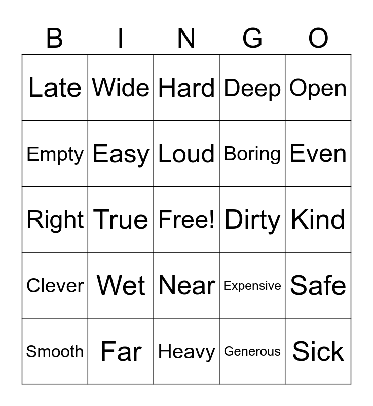 This bingo card has a free space and 24 words: Wet, Far, Loud, Smooth, Open, Late, Empty, Wide, Dirty, Near, Boring, Right, Expensive, Safe, Easy, Generous, Kind, Hard, Even, True, Sick, Clever, Deep and Heavy.
