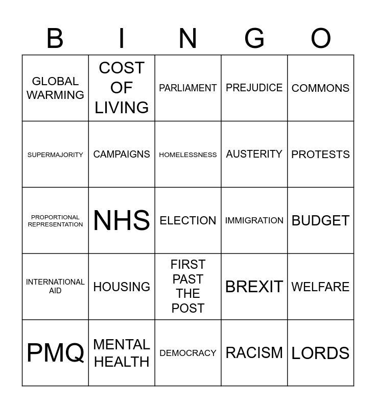This bingo card has a free space and 24 words: HOUSING, MENTAL HEALTH, HOMELESSNESS, PMQ, COMMONS, GLOBAL WARMING, SUPERMAJORITY, COST OF LIVING, IMMIGRATION, FIRST PAST THE POST, AUSTERITY, PROPORTIONAL REPRESENTATION, BREXIT, WELFARE, CAMPAIGNS, RACISM, BUDGET, PARLIAMENT, PROTESTS, NHS, LORDS, INTERNATIONAL AID, PREJUDICE and DEMOCRACY.