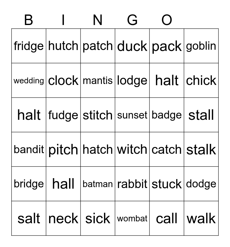 This bingo card has 36 words: rabbit, batman, wombat, wedding, bandit, sunset, clock, sick, pack, stuck, chick, duck, dodge, fudge, lodge, fridge, bridge, badge, halt, patch, stitch, pitch, witch, hatch, catch, hutch, halt, neck, mantis, goblin, walk, salt, stalk, stall, hall and call.