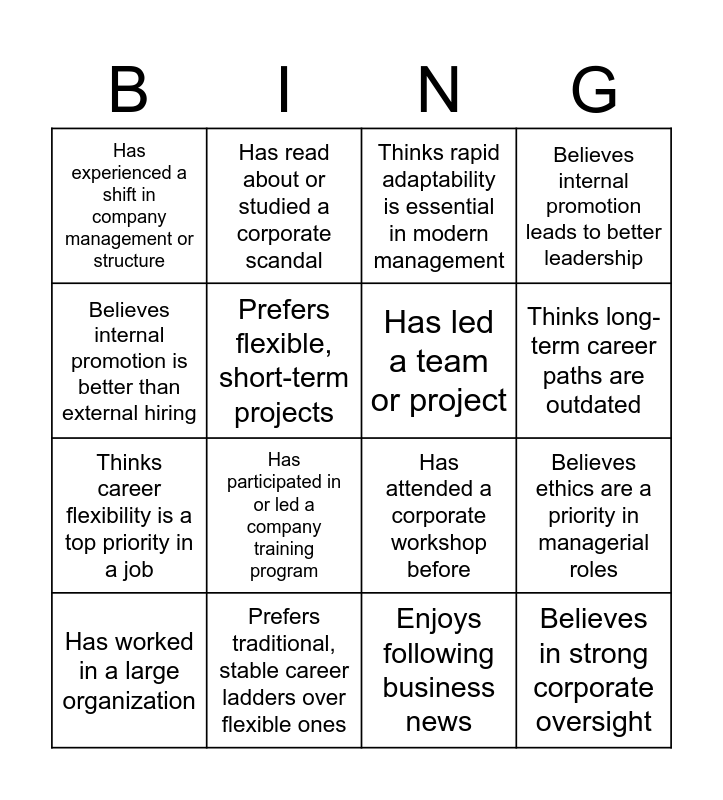 This bingo card has 16 words: Prefers traditional, stable career ladders over flexible ones, Believes ethics are a priority in managerial roles, Thinks rapid adaptability is essential in modern management, Has experienced a shift in company management or structure, Thinks career flexibility is a top priority in a job, Has read about or studied a corporate scandal, Has attended a corporate workshop before, Enjoys following business news, Believes internal promotion is better than external hiring, Prefers flexible, short-term projects, Has worked in a large organization, Believes internal promotion leads to better leadership, Has participated in or led a company training program, Thinks long- term career paths are outdated, Has led a team or project and Believes in strong corporate oversight.