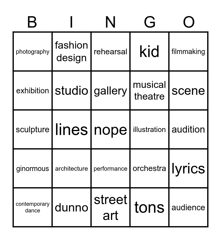 This bingo card has 25 words: architecture, street art, gallery, contemporary dance, filmmaking, photography, exhibition, fashion design, illustration, performance, musical theatre, sculpture, orchestra, lyrics, studio, audience, audition, rehearsal, scene, lines, nope, dunno, ginormous, kid and tons.
