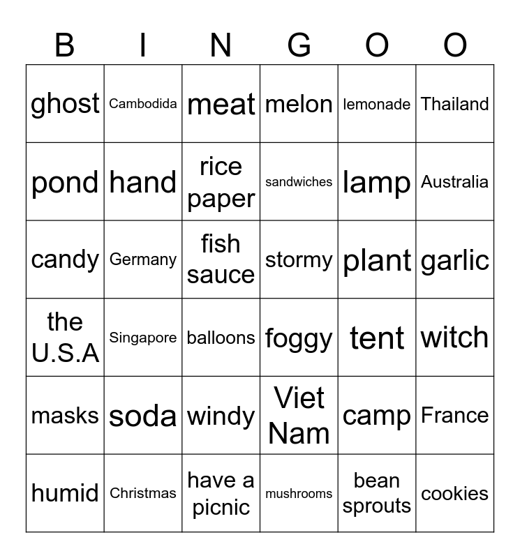 This bingo card has 36 words: Viet Nam, windy, mushrooms, pond, the U.S.A, stormy, hand, have a picnic, lemonade, camp, Australia, melon, France, Germany, sandwiches, ghost, masks, plant, candy, meat, fish sauce, Singapore, foggy, balloons, tent, Cambodida, lamp, Christmas, rice paper, Thailand, cookies, humid, witch, garlic, soda and bean sprouts.