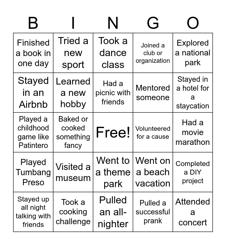 This bingo card has a free space and 50 words: Took a spontaneous road trip, Attended a concert, Tried a cooking class, Pulled an all-nighter, Visited a museum, Worked remotely in pajamas, Tried a new sport, Presented in front of a group, Stayed in an Airbnb, Did a random act of kindness, Learned a new hobby, Joined a club or organization, Completed a DIY project, Went on a beach vacation, Completed a fitness challenge, Attended a workshop or seminar, Had a picnic with friends, Volunteered for a cause, Tried public speaking, Explored a national park, Baked or cooked something fancy, Pulled a successful prank, Finished a book in one day, Mentored someone, Learned a new language, Organized or cleaned your workspace, Stayed in a hotel for a staycation, Made a homemade gift, Took a dance class, Went to a theme park, Took a family vacation, Went on a spontaneous weekend getaway, Had a game night with friends, Went to a farmers’ market, Took a cooking challenge, Attended a film festival, Volunteered at an animal shelter, Tried a new dessert, Made a vision board, Had a movie marathon, Took a yoga class, Ran a marathon or race, Joined a fitness boot camp, Had a road trip with friends, Stayed up all night talking with friends, Played a childhood game like Patintero, Played Chinese garter with friends, Played Pogs or text, Played Tumbang Preso and Did a fun craft project.