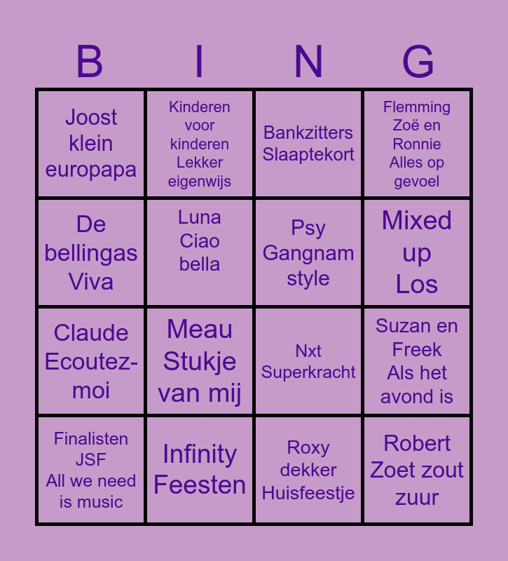 This bingo card has 24 words: Roxy dekker Industry plant, Stay tuned Music, Mixed up Los, Snollebollekes Van links naar rechts, De bellingas Viva, Joost klein europapa, Luna Ciao bella, Kinderen voor kinderen Lekker eigenwijs, Infinity Feesten, Unity Best friends, Claude Ecoutez-moi, Nxt Superkracht, Wil.i.am I like to move iT t move it, Sep en jasmijn Holding on to you, Psy Gangnam style, Nielson Sexy als ik dans, Roxy dekker Huisfeestje, Bankzitters Slaaptekort, Meau Stukje van mij, Suzan en Freek Als het avond is, Finalisten JSF All we need is music, Robert Zoet zout zuur, Flemming Zoë en Ronnie Alles op gevoel and Flemming Automatisch.