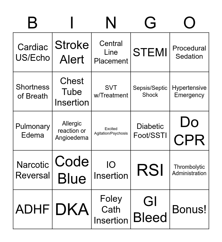 This bingo card has 29 words: ADHF, ETOH Withdrawal, Allergic reaction or Angioedema, Bonus!, Cardiac US/Echo, Central Line Placement, Chest Tube Insertion, Code Blue, Diabetic Foot/SSTI, DKA, Do CPR, Excited Agitation/Psychosis, Foley Cath Insertion, GI Bleed, Hypertensive Emergency, Incision & Drainage, IO Insertion, Narcotic Reversal, Procedural Sedation, Pulmonary Edema, RSI, Seizure, Sepsis/Septic Shock, Shortness of Breath, STEMI, Stroke Alert, Thrombolytic Administration, SVT w/Treatment and Unresponsive.