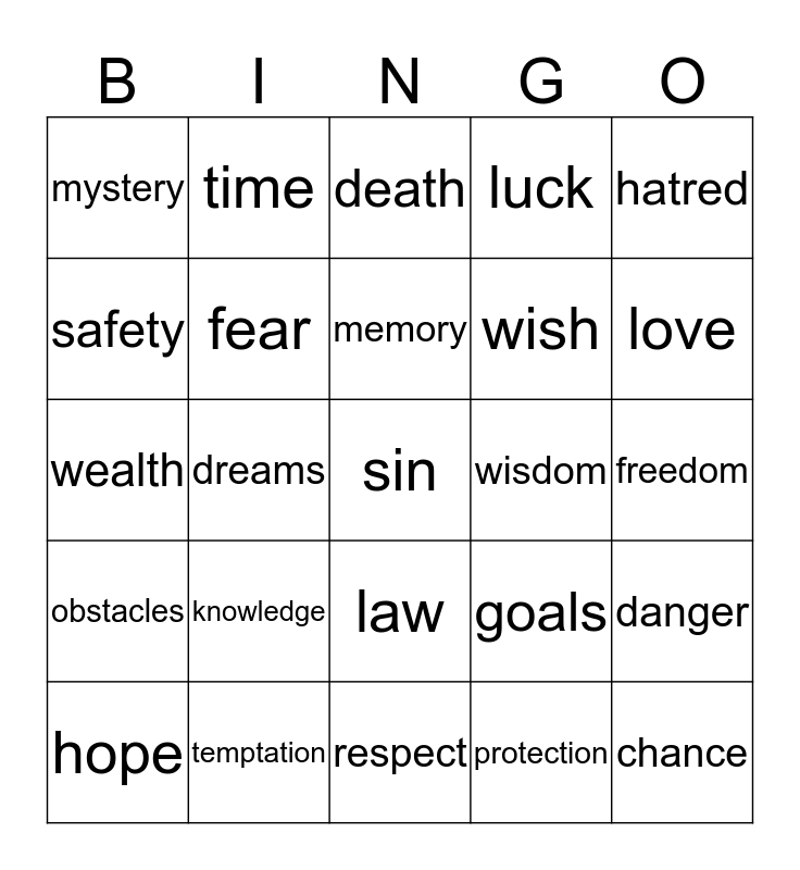 This bingo card has 32 words: protection, romance, dreams, commit-ment, obstacles, fear, hatred, danger, time, chance, memory, death, idea, adventure, wisdom, beauty, hope, wealth, law, knowledge, goals, freedom, freedom, temptation, sin, luck, wish, safety, mystery, respect, justice and love.