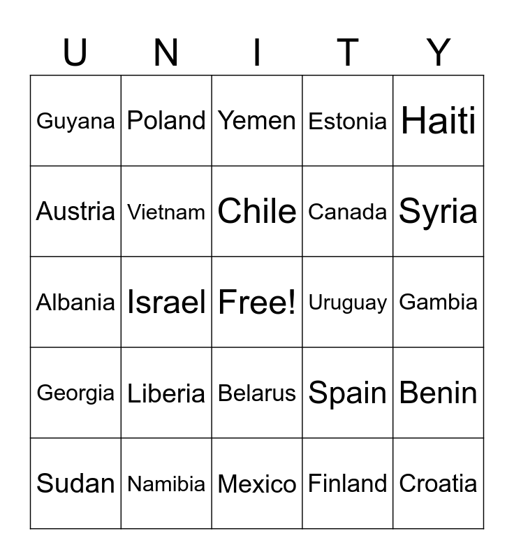 This bingo card has a free space and 75 words: Andorra, Jordan, Yemen, Bhutan, Kenya, Kosovo, Burundi, Serbia, Iceland, Tonga, Moldova, Brazil, Chile, Austria, Comoros, Israel, Ukraine, Croatia, Latvia, Haiti, Denmark, Albania, Vietnam, Poland, Estonia, Malawi, Gabon, Tunisia, Guinea, Japan, Samoa, Rwanda, Ghana, Spain, Syria, Canada, Bahamas, Sweden, Gambia, Finland, Norway, Panama, Armenia, China, Belize, Malta, Sudan, Guyana, Nepal, Grenada, Slovakia, Belarus, Lesotho, Greece, Togo, Uganda, Cyprus, Kuwait, France, Zambia, Liberia, Brunei, Turkey, Ecuador, Qatar, Uruguay, Angola, Lebanon, Italy, Benin, Georgia, Namibia, Egypt, Mexico and India.