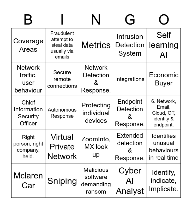 This bingo card has 50 words: Free!, Protecting individual devices, Security Information and Event Management, Malicious software demanding ransom, Virtual Private Network, Block unauthorized access, Fraudulent attempt to steal data usually via emails, Self-learning Artificial Intelligence (AI), Network traffic, user behaviour, Bring Your Own Device, Secure remote connections, Intrusion Detection System, Identifies unusual behaviours in real time, Extended detection & Response., Intrusion Prevention System., Identity & Asset Management., Network Detection & Response., Endpoint Detection & Response., Security Information & Event management., Self learning AI, Autonomous Response, Cyber AI Analyst, Coverage Areas, Integrations, Covering the entire attack life cycle, Identify, indicate, Implicate., Economic Buyer, Implicate Pain, Metrics, ZoomInfo, MX look up, Microsoft, Jill Popelka, Jon Gainey, 2013, Sniping, 75%, 2 or 3, 9000+, 92%, 6. Network, Email, Cloud, OT, identity & endpoint., 2400+, Cambridge & San Francisco, Azure, The POD., Mclaren Car, Chief Information Security Officer, Natural History Museum, 94%, Right person, right company, held. and Pain point & next steps agreed..