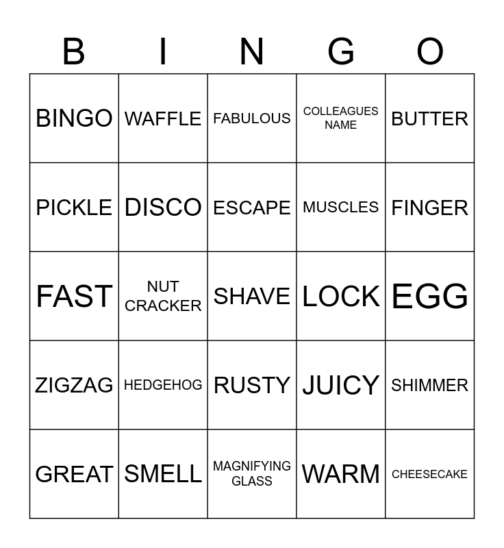 This bingo card has a free space and 24 words: HEDGEHOG, SMELL, ESCAPE, GREAT, BUTTER, BINGO, PICKLE, WAFFLE, LOCK, RUSTY, MUSCLES, FAST, JUICY, SHIMMER, DISCO, WARM, EGG, FABULOUS, FINGER, NUT CRACKER, CHEESECAKE, ZIGZAG, COLLEAGUES NAME and MAGNIFYING GLASS.