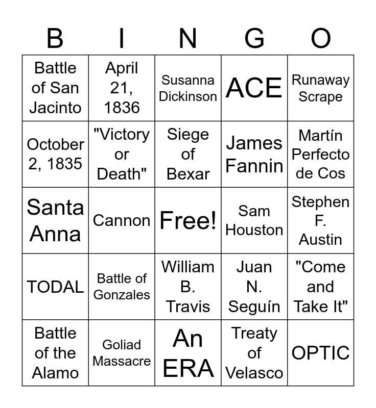 This bingo card has a free space and 24 words: Battle of Gonzales, Goliad Massacre, Siege of Bexar, Battle of the Alamo, Runaway Scrape, Battle of San Jacinto, October 2, 1835, April 21, 1836, Sam Houston, William B. Travis, James Fannin, Santa Anna, Juan N. Seguín, "Come and Take It", "Victory or Death", Treaty of Velasco, Stephen F. Austin, Susanna Dickinson, Martín Perfecto de Cos, Cannon, OPTIC, TODAL, ACE and An ERA.
