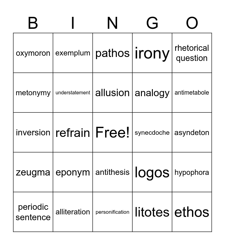 This bingo card has a free space and 24 words: eponym, alliteration, allusion, periodic sentence, rhetorical question, oxymoron, metonymy, exemplum, synecdoche, antithesis, analogy, inversion, logos, hypophora, understatement, litotes, asyndeton, pathos, antimetabole, refrain, ethos, zeugma, irony and personification.
