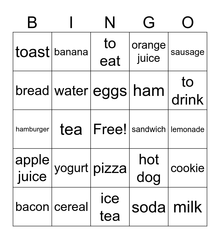 This bingo card has a free space and 24 words: yogurt, cereal, eggs, bacon, sausage, toast, bread, banana, sandwich, pizza, ham, hamburger, hot dog, cookie, water, soda, lemonade, to eat, to drink, tea, milk, apple juice, orange juice and ice tea.