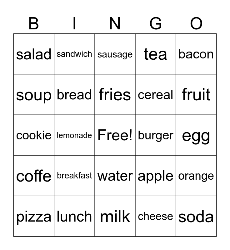 This bingo card has a free space and 24 words: breakfast, lunch, fries, pizza, bacon, salad, soup, sandwich, burger, water, cereal, cookie, apple, orange, bread, cheese, egg, sausage, fruit, lemonade, soda, coffe, tea and milk.