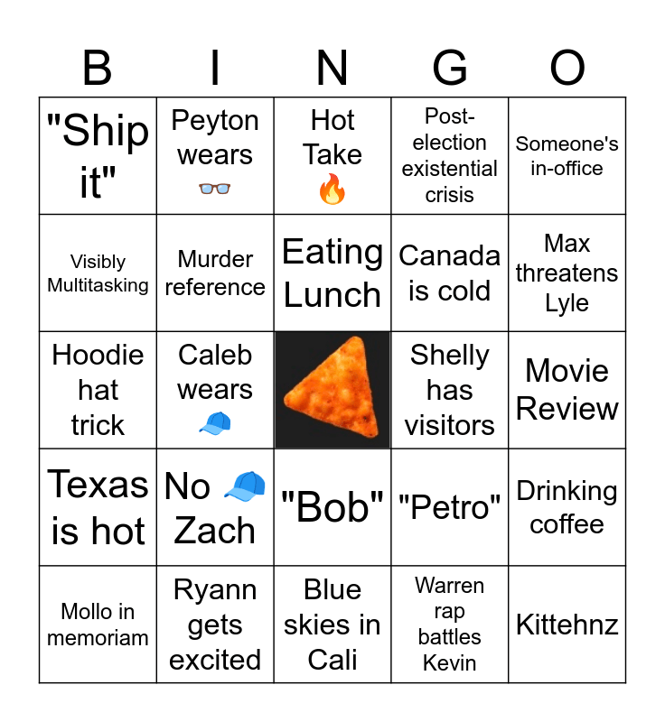 This bingo card has a free space and 29 words: Mollo in memoriam, Christmas Party News, Caleb wears 🧢, Leighanne comes off mute, "Ship it", Hot Take 🔥, Murder reference, No 🧢Zach, Shelly has visitors, Ryann gets excited, Movie Review, Kittehnz, Blue skies in Cali, Warren rap battles Kevin, Max threatens Lyle, Puppers, "Bob", Texas is hot, Someone's in-office, Hoodie hat trick, "Petro", Great Lighting, Canada is cold, Visibly Multitasking, Post-election existential crisis, Peyton wears 👓, Drinking coffee, Eating Lunch and Frozen Face.