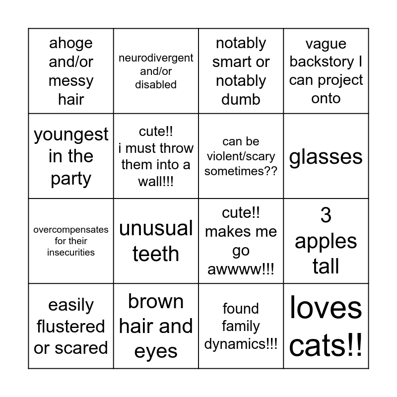 This bingo card has 16 words: brown hair and eyes, 3 apples tall, notably smart or notably dumb, ahoge and/or messy hair, overcompensates for their insecurities, neurodivergent and/or disabled, cute!! makes me go awwww!!!, found family dynamics!!!, youngest in the party, cute!! i must throw them into a wall!!!, easily flustered or scared, vague backstory I can project onto, unusual teeth, glasses, can be violent/scary sometimes?? and loves cats!!.