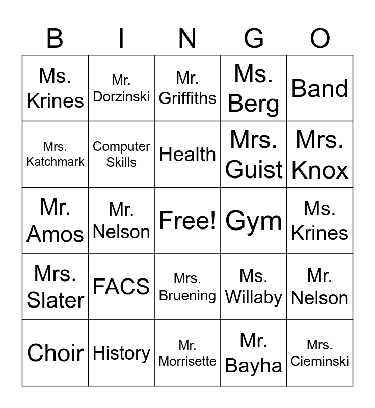 This bingo card has a free space and 34 words: Mr. Nelson, Mr. Bayha, Mrs. Kennedy, Tigers, Mrs. Slater, Computer Skills, Band, Choir, Mr. Dorzinski, Math, Health, Mr. Griffiths, Ms. Hogan, Art, Gym, Mrs. Knox, History, Mr. Amos, FACS, Ms. Willaby, Mrs. Bruening, Mr. Louis, Ms. Krines, Ms. Krines, Mr. Morrisette, Mrs. Cieminski, Ms. Berg, Mrs. Redman, Mrs. Guist, Mrs. Katchmark, Mrs. Lane, Mr. Nelson, Mr. Nelson and Mr. Nelson.