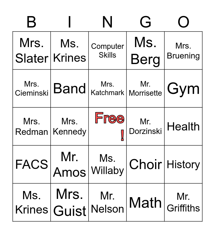 This bingo card has a free space and 31 words: Mr. Nelson, Mr. Bayha, Mrs. Kennedy, Tigers, Mrs. Slater, Computer Skills, Band, Choir, Mr. Dorzinski, Math, Health, Mr. Griffiths, Ms. Hogan, Art, Gym, Mrs. Knox, History, Mr. Amos, FACS, Ms. Willaby, Mrs. Bruening, Mr. Louis, Ms. Krines, Ms. Krines, Mr. Morrisette, Mrs. Cieminski, Ms. Berg, Mrs. Redman, Mrs. Guist, Mrs. Katchmark and Mrs. Lane.
