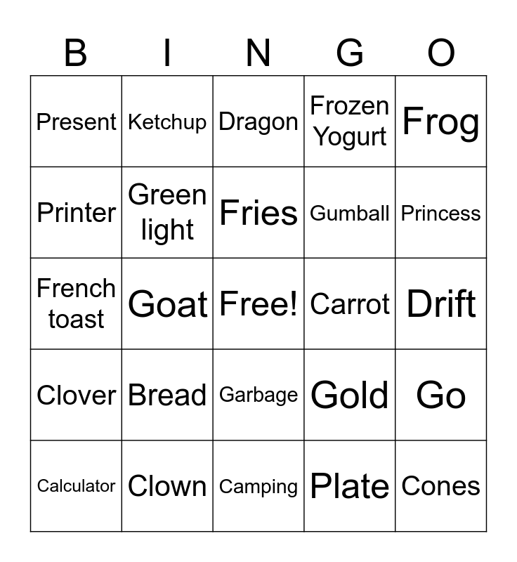 This bingo card has a free space and 80 words: Bracelet, Bread, Dragon, Drit, Drumsticks, Frog, French Toast, Fries, Green Light, Drill, Grapes, Grater, Frozen Yogurt, Present, Princess, Printer, Bracelet, Bread, Dragon, Drift, Drumsticks, Frog, French toast, Fries, Green light, Drill, Grapes, Grater, Frozen Yogurt, Present, Princess, Printer, Camping, Can opener, Calculator, Carrot, Cash, Castle, Cabbage, Cones, Cookbook, Corn, Couch, Kangaroo, Kazoo, Ketchup, Kite, Kitten, Gas Pump, Gate, Go, Goat, Gold, Golf, Gum, Goldfish, Gummy bear, Goose, Gorilla, Garbage, Gumball, Guitar, Guacamole, Garlic, Black Bear, Bleachrs, Blackberry, Blackboard, Flower, Climb, Clover, Clown, Glasses, Globe, Gloves, Glue, Plate, Plug, Plum and Plus.