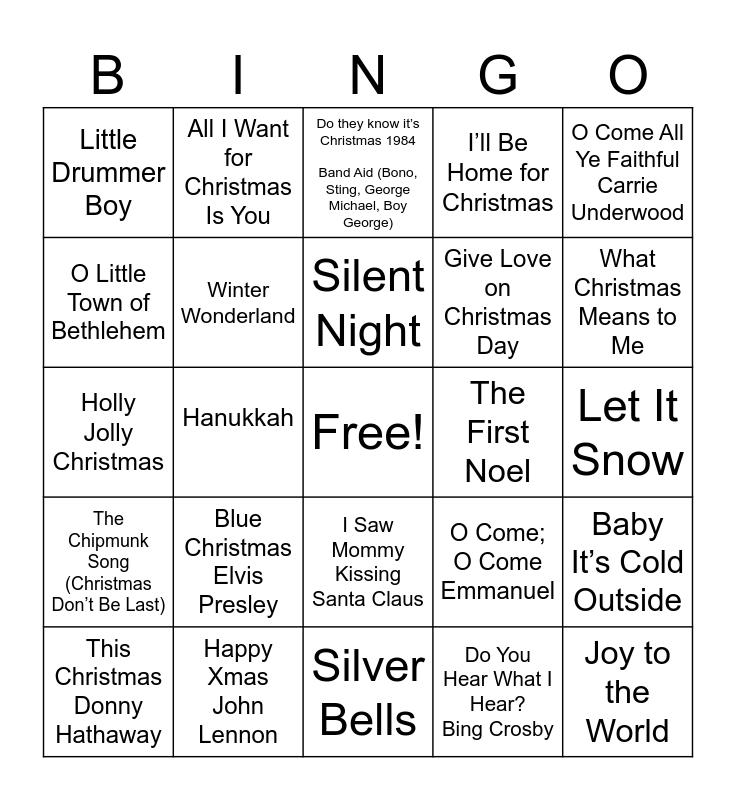 This bingo card has a free space and 24 words: Blue Christmas Elvis Presley, Happy Xmas John Lennon, Silent Night, This Christmas Donny Hathaway, O Come All Ye Faithful Carrie Underwood, Little Drummer Boy, O Little Town of Bethlehem, All I Want for Christmas Is You, The First Noel, I Saw Mommy Kissing Santa Claus, Give Love on Christmas Day, Holly Jolly Christmas, O Come; O Come Emmanuel, Baby It’s Cold Outside, Winter Wonderland, Do You Hear What I Hear? Bing Crosby, Let It Snow, Do they know it’s Christmas 1984 Band Aid (Bono, Sting, George Michael, Boy George), What Christmas Means to Me, Hanukkah, Joy to the World, The Chipmunk Song (Christmas Don’t Be Last), I’ll Be Home for Christmas and Silver Bells.