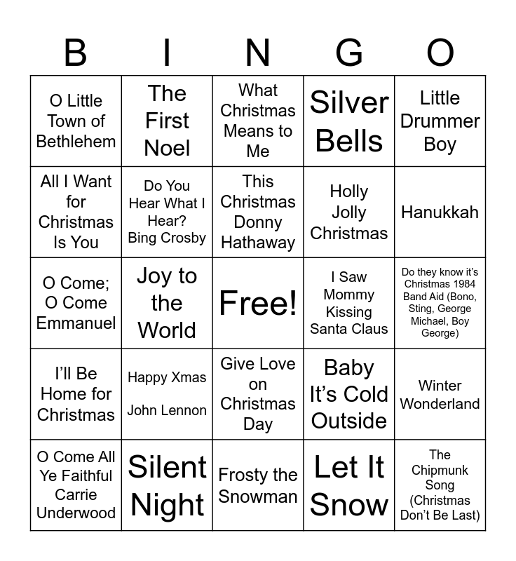 This bingo card has a free space and 24 words: Happy Xmas John Lennon, Silent Night, This Christmas Donny Hathaway, O Come All Ye Faithful Carrie Underwood, Little Drummer Boy, O Little Town of Bethlehem, All I Want for Christmas Is You, The First Noel, I Saw Mommy Kissing Santa Claus, Give Love on Christmas Day, Holly Jolly Christmas, O Come; O Come Emmanuel, Baby It’s Cold Outside, Winter Wonderland, Do You Hear What I Hear? Bing Crosby, Let It Snow, Do they know it’s Christmas 1984 Band Aid (Bono, Sting, George Michael, Boy George), What Christmas Means to Me, Hanukkah, Joy to the World, The Chipmunk Song (Christmas Don’t Be Last), I’ll Be Home for Christmas, Silver Bells and Frosty the Snowman.