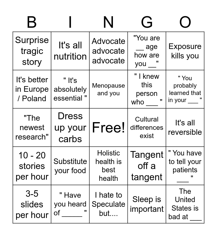 This bingo card has a free space and 24 words: Substitute your food, " Have you heard of _____ ", Menopause and you, 3-5 slides per hour, Exposure kills you, Surprise tragic story, It's better in Europe / Poland, It's all nutrition, Cultural differences exist, Holistic health is best health, " I knew this person who ___ ", "The newest research", Tangent off a tangent, " You have to tell your patients ___ ", " It's absolutely essential ", Sleep is important, It's all reversible, Advocate advocate advocate, " You probably learned that in your ___ ", Dress up your carbs, The United States is bad at ___, 10 - 20 stories per hour, "You are __ age how are you __" and I hate to Speculate but.....