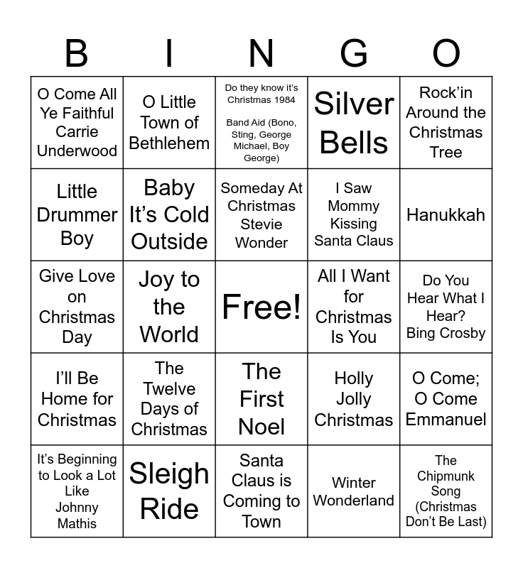 This bingo card has a free space and 24 words: The Twelve Days of Christmas, Sleigh Ride, Someday At Christmas Stevie Wonder, It’s Beginning to Look a Lot Like Johnny Mathis, Rock’in Around the Christmas Tree, O Come All Ye Faithful Carrie Underwood, Little Drummer Boy, O Little Town of Bethlehem, All I Want for Christmas Is You, The First Noel, I Saw Mommy Kissing Santa Claus, Give Love on Christmas Day, Holly Jolly Christmas, O Come; O Come Emmanuel, Baby It’s Cold Outside, Winter Wonderland, Do You Hear What I Hear? Bing Crosby, Do they know it’s Christmas 1984 Band Aid (Bono, Sting, George Michael, Boy George), Hanukkah, Joy to the World, The Chipmunk Song (Christmas Don’t Be Last), I’ll Be Home for Christmas, Silver Bells and Santa Claus is Coming to Town.