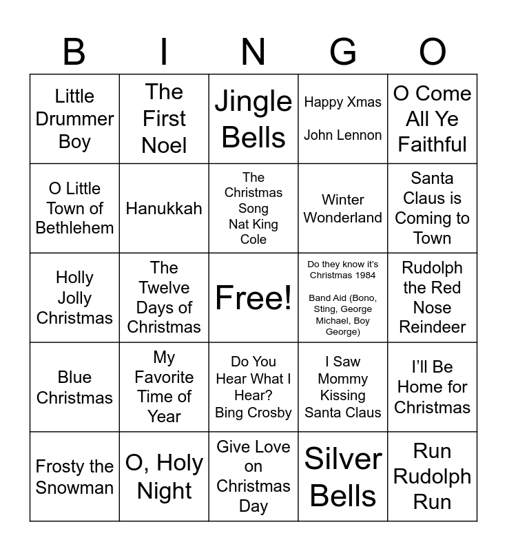 This bingo card has a free space and 24 words: My Favorite Time of Year, O, Holy Night, The Christmas Song Nat King Cole, Frosty the Snowman, O Come All Ye Faithful, Little Drummer Boy, O Little Town of Bethlehem, The First Noel, Do they know it’s Christmas 1984 Band Aid (Bono, Sting, George Michael, Boy George), Do You Hear What I Hear? Bing Crosby, Winter Wonderland, Holly Jolly Christmas, I Saw Mommy Kissing Santa Claus, I’ll Be Home for Christmas, Hanukkah, Silver Bells, Rudolph the Red Nose Reindeer, Jingle Bells, Santa Claus is Coming to Town, The Twelve Days of Christmas, Run Rudolph Run, Blue Christmas, Happy Xmas John Lennon and Give Love on Christmas Day.